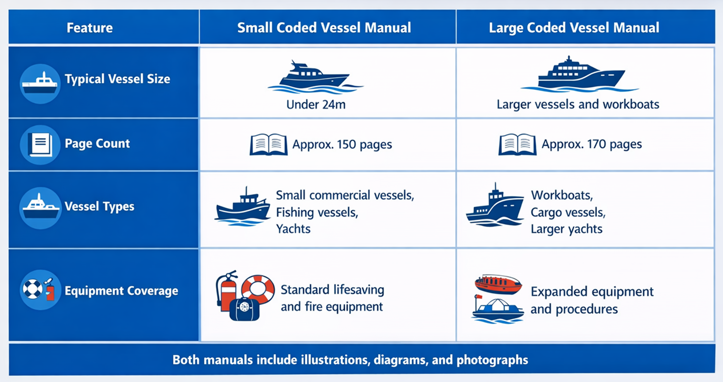 Small coded vessel manuals are designed for vessels under 24 metres and typically contain around 150 pages of safety guidance. Large coded vessel manuals are used on larger vessels and provide expanded coverage of safety equipment and operational procedures.